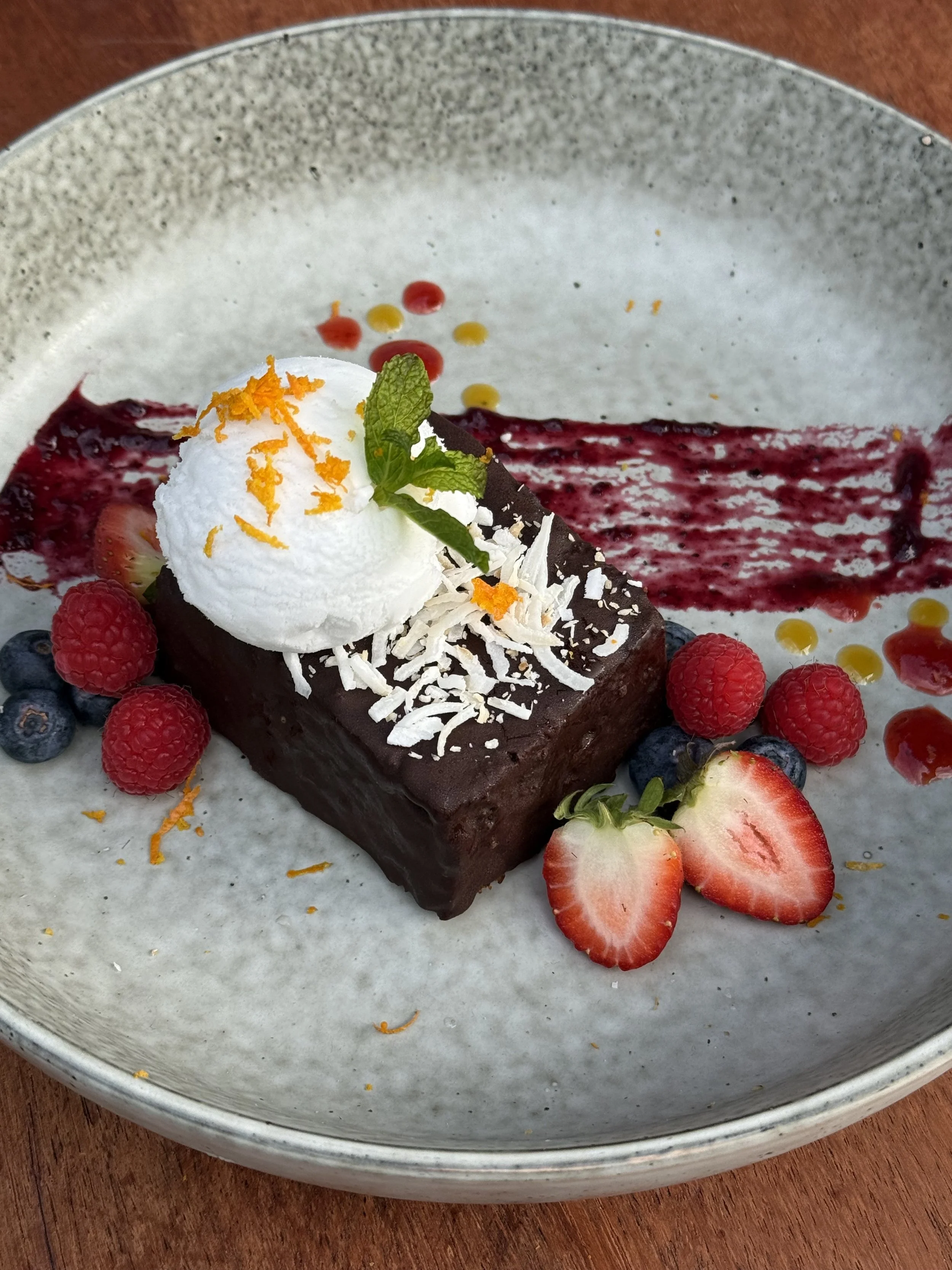ORGANIC YOGURT BASED CHOCOLATE CAKE WITH A RICH DARK CHOCOLATE TOPPING, SERVED WITH DAIRY FREE COCONUT ICE CREAM